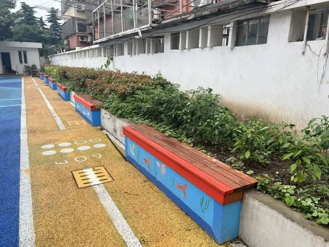 值得一提的是,此次升級改造還大大美化了養老服務站周圍的環境。走近綠梅社區家門口養老服務站,放眼望去都是充滿童趣味的畫作,地面上有迷宮、腳印、綠色梅花等,座椅上、墻面上等也有許多五顏六色的畫作,這些畫作是工作人員和日托老年人一起完成的。