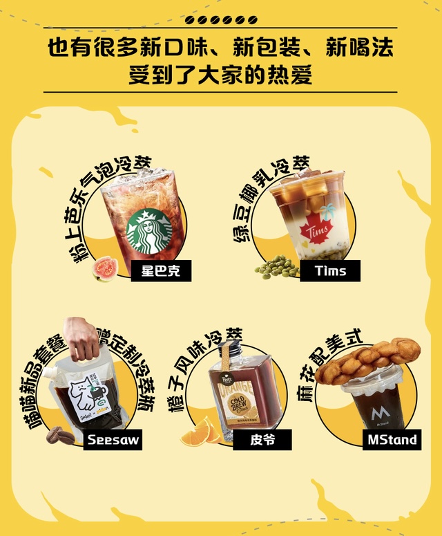 無論是咖啡的新包裝、新口味,還是新喝法都受到了大家的關注。粉上芭樂氣泡冷萃、綠豆椰乳冷萃、橙子風味冷萃......層出不窮的新口味引來市民朋友們紛紛打卡,而隨著不斷地探索和實踐,也為城市生活帶來新的感受和體驗。