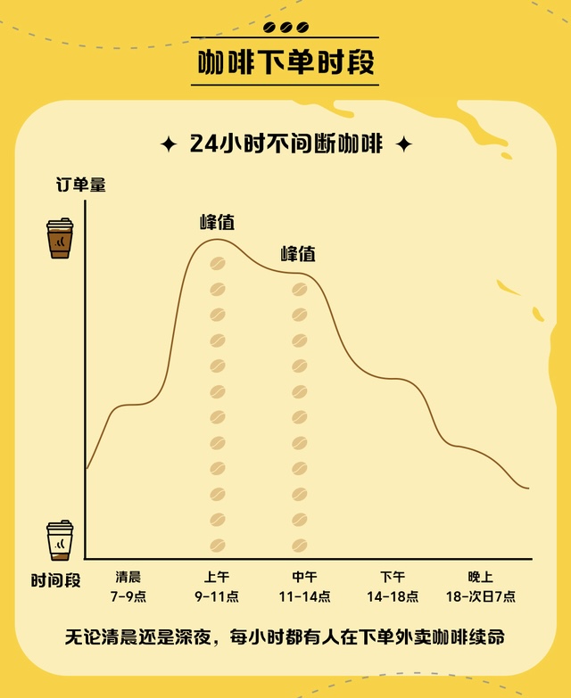 數據顯示,早晨7至9點,咖啡外賣訂單量就開始逐步攀升;上午9至11點,第一個峰值出現,而這也是全天訂單量最高的時間段。