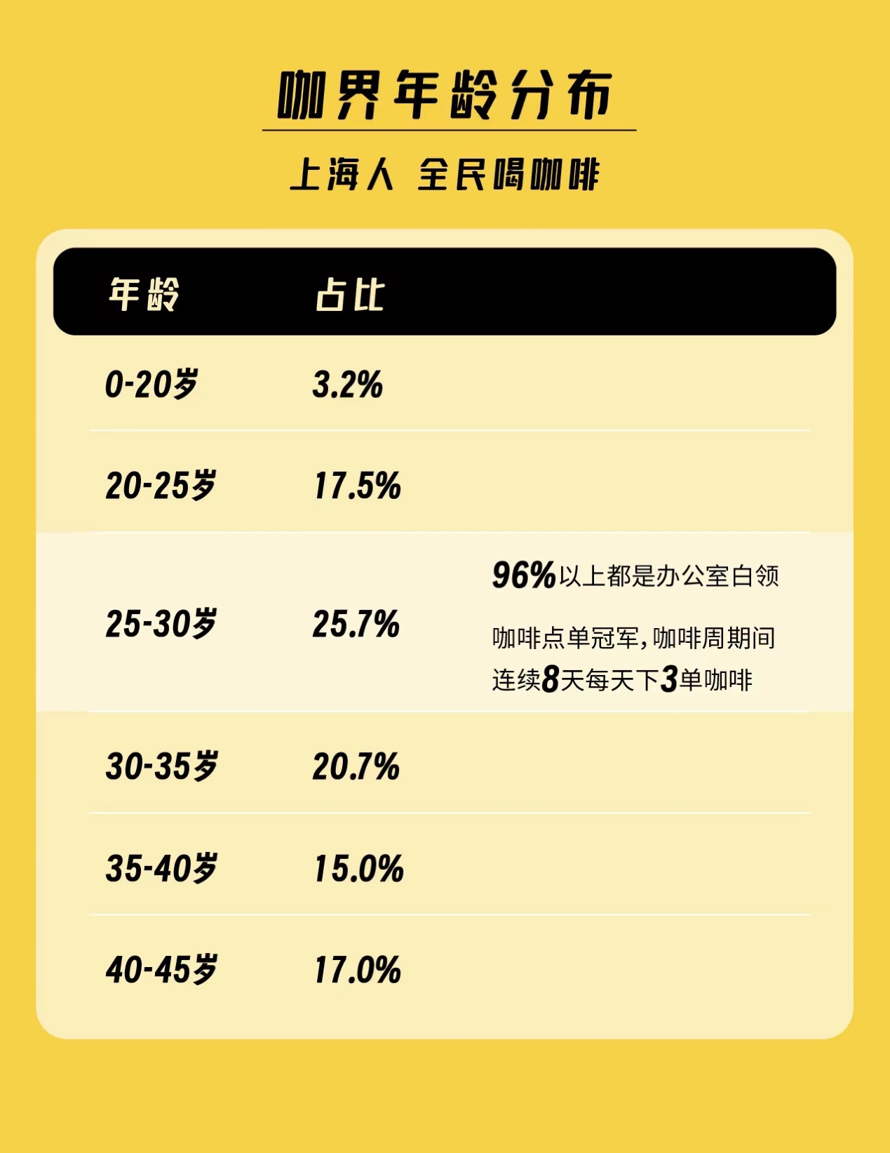 就在上??Х任幕芷陂g的連續8天,有人每天都下3單咖啡。除此之外,30-35歲占比20.7%,35-40歲占比15.0%,而40歲以上人群的點單量又有小幅度提升,達到17%。