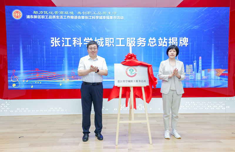 與會領導和嘉賓為浦東新區職工品質生活聯盟和張江科學城職工服務總站揭牌。
