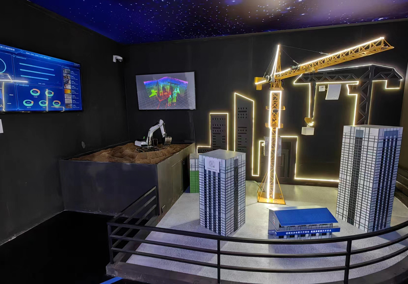 “哐哐哐……”在模擬黑夜的星空下,智能無人塔吊模型和智能無人挖掘機模型正在繁忙的工地場景中施工,精準、高效地進行著吊裝和挖掘工作。在工地場景另一邊的屏幕上展示的是智慧工地管理平臺,它可現場采集塔吊機、挖掘機、升降機的安全工況和環境數據,全方位實時監控工地狀況。