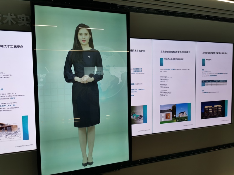 低碳建筑館由全聯房地產商會建筑節能產業分會、中國建筑金屬結構協會建筑遮陽分會、上海市勘察設計行業協會新型建設材料推廣中心聯合主辦設立。走進該館,一個真人大小的數字人出現在記者眼前。她亭亭玉立,向觀眾講解“上海超低能耗建筑關鍵技術實施要點”,包含技術路徑、圍護結構、外門窗和遮陽等內容。