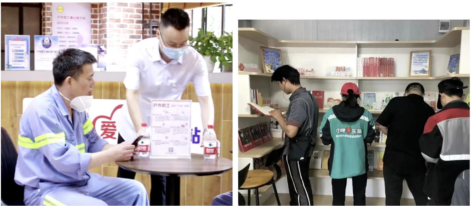 此外,在社區黨群服務中心、諾源戶外職工愛心接力站、環上大2號科技園等陣地,還特別設置了一排小型職工書屋,方便快遞員們閱讀和休憩,讓他們在歇腳的時間里為自己充電蓄能,在城市的角落營造溫暖、互助的紅色正能量。