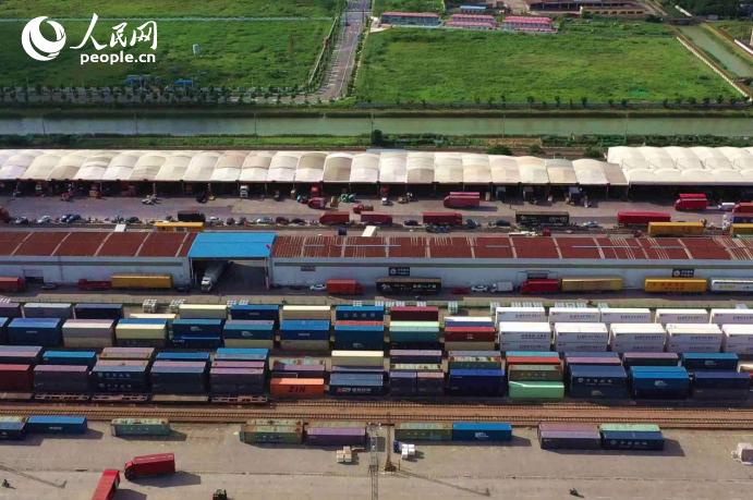 巨大的龍門吊來回移動,將一組組集裝箱準確吊裝至車板之上,很快,它們將由班列運載著發往歐亞各國。