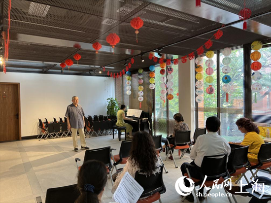 二樓的“小舞臺”里,愛美聲藝術沙龍正在進行。記者和參觀團的同志推門一看,一位老人正準備登臺開唱,他一開口大家都驚訝了?!斑@哪里是業余選手,有腔調!”參觀團的同志不禁為上海市民豎起了大拇指。