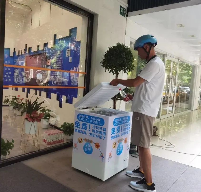 據悉,“愛心冰箱”是新華路街道針對新就業群體推出的一項愛心舉措。早在2022年夏季,新華路街道便為轄區內“暖新巢”的11個快遞、外賣前置站分別送上了冰箱或保溫箱。今年夏天,新華路街道社區黨群服務中心更加貼心地將“愛心冰箱”的服務范圍進一步擴大,讓在新華路街道轄區內送餐、送貨的快遞、外賣騎手們,都能近距離喝到免費的冰飲,及時消暑。