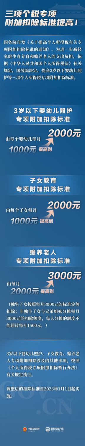 為進一步減輕家庭生育養育和贍養老人的支出負擔,依據《中華人民共和國個人所得稅法》有關規定,國務院決定,提高3歲以下嬰幼兒照護等三項個人所得稅專項附加扣除標準?,F將有關事項通知如下: