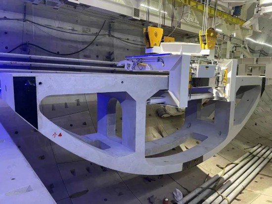 “驥躍號”盾構機自2022年10月21日始發后,克服了施工環境復雜、地質種類多樣、掘進過程中穿越運營中既有鐵路及軌道交通的難點,最終在2#風井順利完成接收。本次“驥躍號”盾構機在掘進施工中的一大亮點,便是搭載了超大直徑盾構同步推拼技術。