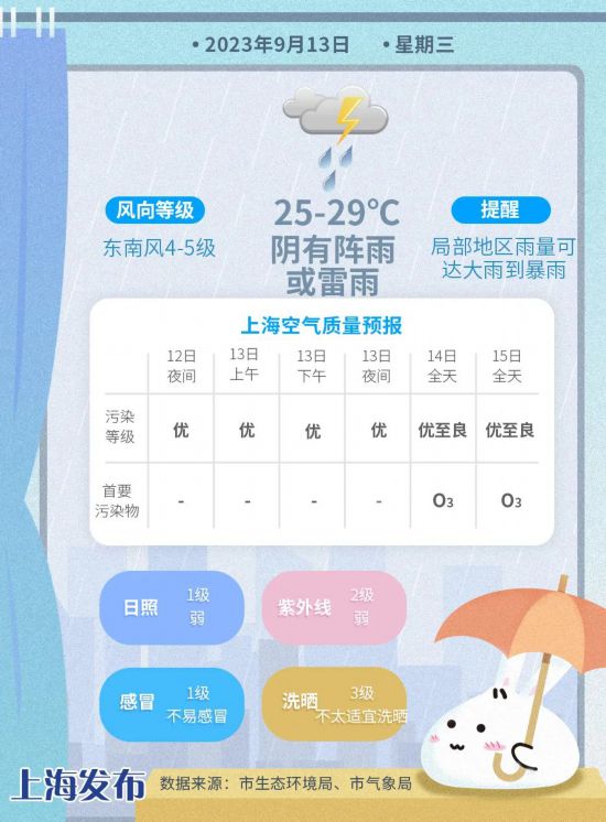 預計13日到15日我市有大雨到暴雨,主要降水時段出現在13日下午到夜間、14日夜里到15日上午,雨量分布不均,累積雨量50~80毫米,西部和北部地區100~120毫米,崇明局地可達150毫米左右,小時最大雨強30~50毫米。16日仍有中到大雨。
