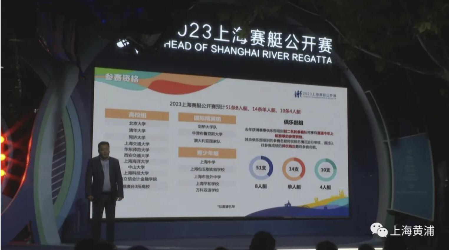 其中,精英組參賽隊伍由劍橋大學賽艇隊、牛津布魯克斯大學賽艇隊、澳大利亞國家賽艇隊等國際頂尖賽艇好手,以及擁有部分國家隊隊員的上海、山東、江蘇等國內強隊;參加高校組比賽的有北京大學、清華大學、上海交通大學、同濟大學、華東師范大學、中山大學、西安交通大學、上海海洋大學、上海立信金融學院、上??萍即髮W、華南理工大學的隊伍,還有來自港澳臺三地的香港大學、澳門大學學生會賽艇會、中國文化大學共14所中國高校學子參賽;俱樂部組方面,獲得2023上海賽艇公開賽直通名額的南京艇友賽艇俱樂部隊、錦江國際賽艇隊、江西深潛賽艇俱樂部、沈陽清泉盛京賽艇俱樂部都將再度參賽。