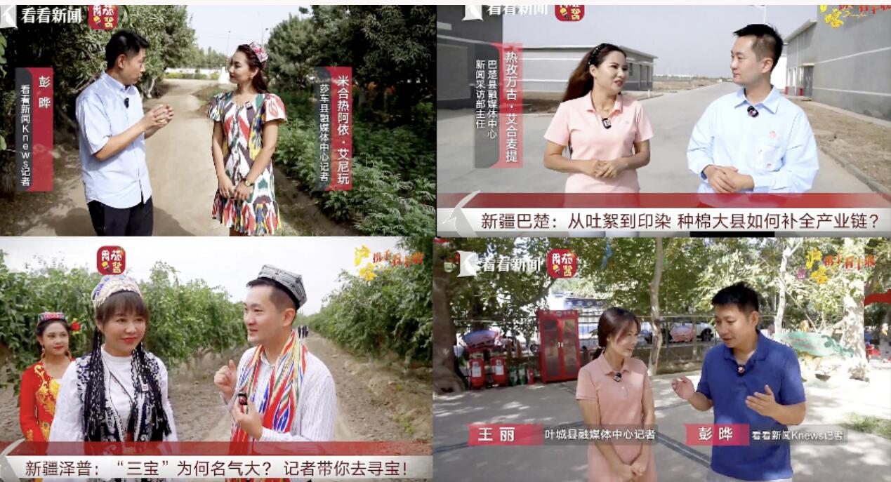 第六屆中國農民豐收節期間,上海廣播電視臺融媒體中心率先與莎車、澤普、葉城、巴楚四縣融媒體中心拉開合作帷幕,從9月21日起連續三天推出特別節目《豐收正當時》。上海廣播電視臺融媒體中心記者聯合莎車、澤普、葉城、巴楚的融媒體中心記者、文旅局干部,走進莎車巴旦木果園感受熱火朝天的采摘現場、體驗式探尋“澤普三寶”好吃的秘密、“中國核桃之鄉”葉城的一樹“金果”如何被吃干榨盡、種棉大縣巴楚如何補全從吐絮到印染的產業鏈……