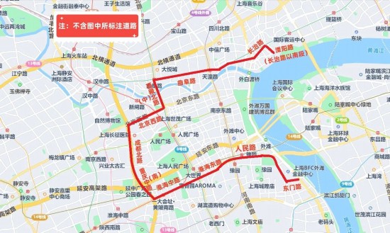 沿溧陽路(長治路以南段)—長治路—天潼路—曲阜路—西藏北路—西藏中路—北京西路—成都北路—重慶中路—重慶南路—淮海中路—淮海東路—人民路—東門路及黃浦江邊所圍合區域內的地面道路(不含上述道路)禁止機動車通行。