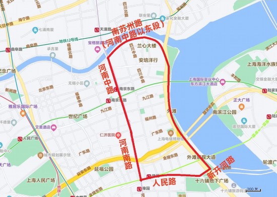 沿南蘇州路(河南中路以東段)—河南中路—河南南路—人民路—新開河路及黃浦江邊所圍合區域內的道路(含上述道路),禁止非機動車通行。