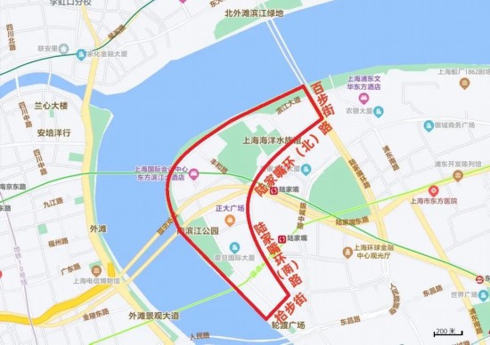 沿百步街—陸家嘴環(北)路—陸家嘴環(南)路—拾步街及黃浦江邊所圍合區域內的道路(不含上述道路),禁止機動車通行。