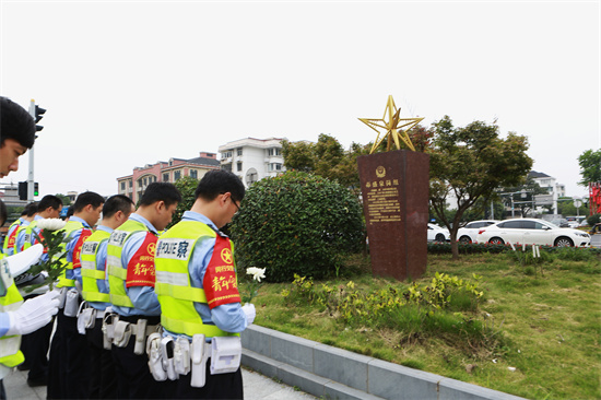 9月30日清晨,一群身著警服的年輕人來到吳中路、虹許路路口,在“茆盛泉崗組”紀念碑前肅立良久。來自閔行公安分局交警支隊的民警深情講述了茆盛泉烈士生前的故事,在場人員無不落淚。8年前,青年民警茆盛泉在該路口執勤時不幸犧牲。同年4月15日,他被授予革命烈士稱號,在他執勤的這個路口也多了一塊“茆盛泉崗組”紀念碑。此后,每年的清明和烈士紀念日,紀念碑前總是擺滿了寄托哀思的鮮花。閔行交警二大隊“茆盛泉崗組”青年民警彭躍輝表示,“我們要努力傳承他的精神,以實際行動保障好道路秩序,為轄區居民安全出行保駕護航!”