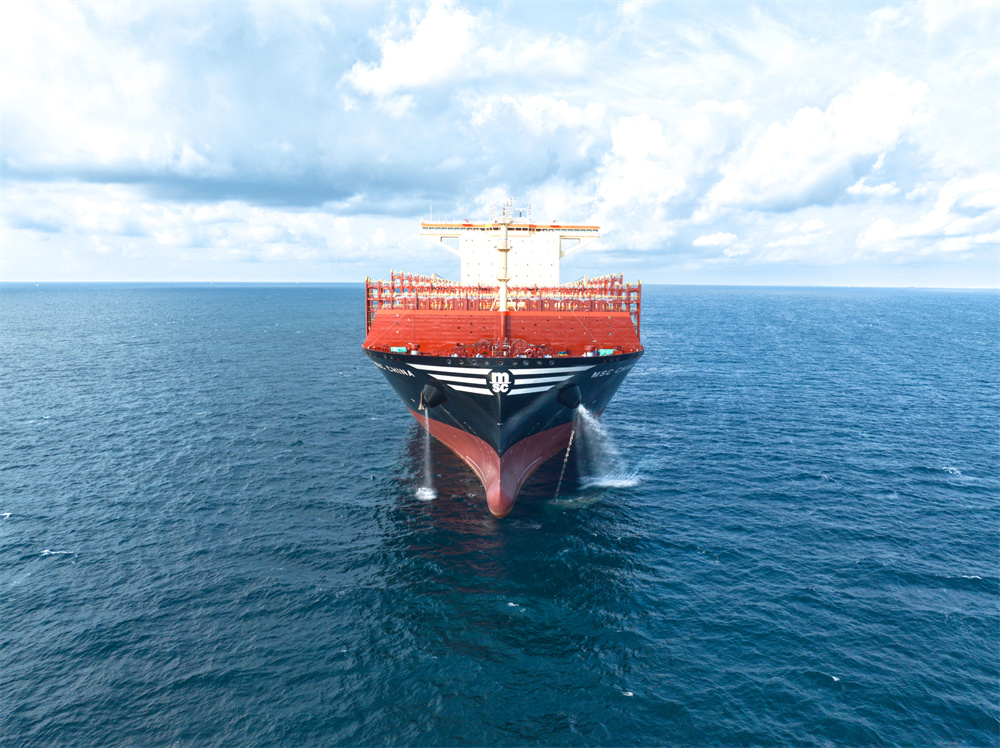 人民網上海10月9日電 (記者葛俊?。?0月9日,中國船舶集團旗下江南造船建造的全球最大級別24000箱超大型集裝箱船“地中?!ぶ袊碧?,提前一個月在中船長興造船基地完工交付。