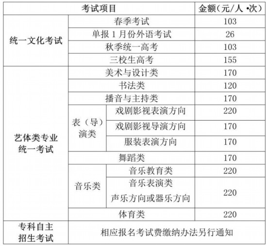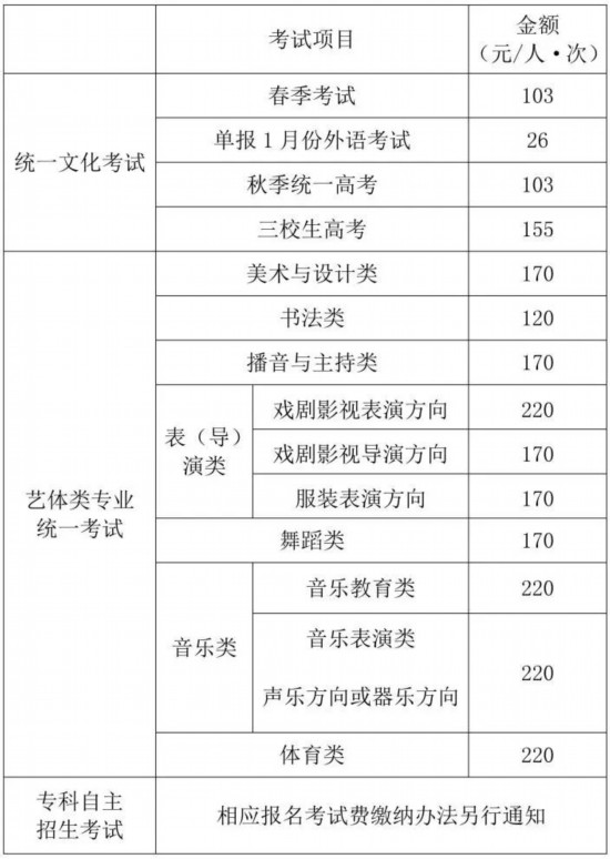 根據《關于上海市教育考試院有關考試收費等問題的復函》(滬價費〔2006〕005號)、《關于調整上海市教育考試院外語口語考試等收費標準的復函》(滬價費〔2003〕069號)文件規定,文化考試收費標準:報名費為每項考試25元/人(??谱灾髡猩鷪竺荚囐M另行通知),考試費為每項考試每科目26元/人;藝體類專業考試收費標準:報名費為每項考試20元/人,考試費為每項考試每科目50元/人。各類考試項目須繳納費用如下表所示: