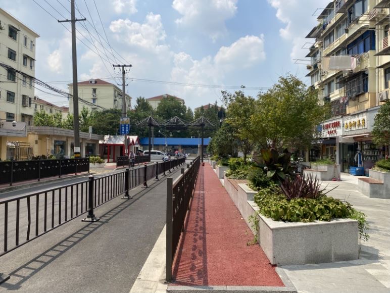 位于上海市楊浦區五角場街道的國定支路睦鄰街區,全長約550米,道路雖短,但基礎設施齊全,沿線分布有菜場、為老服務中心、社區醫療點、學校等公共設施,周邊有3個居委、4個老舊小區、近7000戶約1.2萬居民,是一條自帶“煙火氣”和人流量的街坊道路。