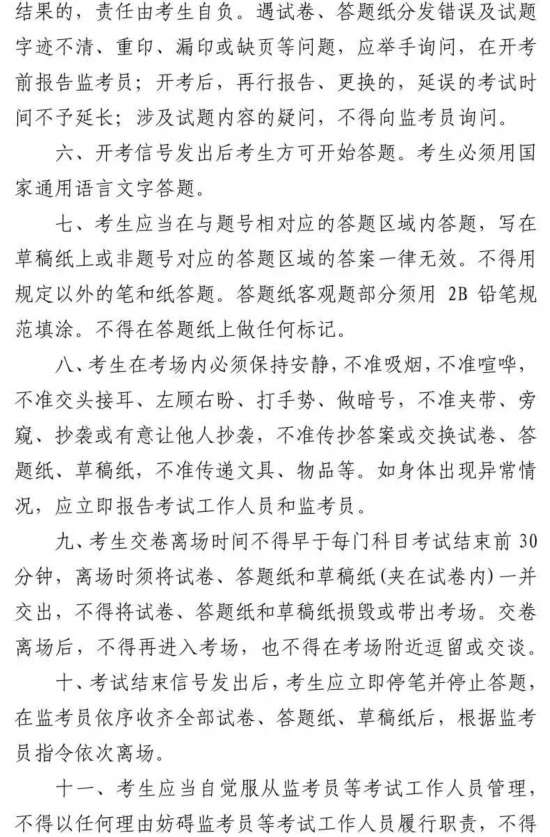 考試期間,考生須遵守考點統一發出的考試指令完成考試。所有考場均實行全覆蓋、全時段網上監控和錄像,監控視頻和錄像都將作為認定考試違規的依據。試題、答題卡、草稿紙等均屬于涉考材料,不允許以任何形式拍照傳出或帶離考場。