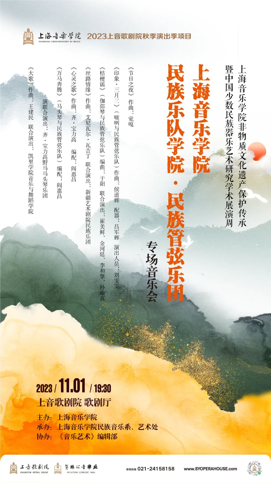 上海音樂學院非物質文化遺產保護傳承暨中國少數民族器樂藝術研究學術展演周系列活動以國家社科基金藝術學科重大課題為主軸,以中國少數民族器樂藝術研究為經線,非物質文化遺產保護及傳承為緯線,經緯相交,凸顯上海音樂學院的演出,科研實力的同時深度挖掘中國傳統民族音樂的文化精髓。