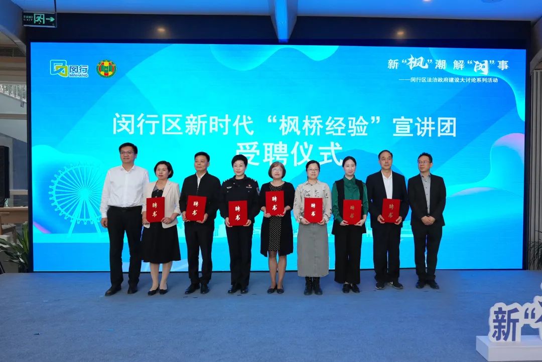 現場,閔行區首批新時代“楓橋經驗”宣講團正式成立,他們中有立足崗位、調解醫患糾紛的全國模范人民調解員;成立“線上警務室”、全天候化解居民矛盾的社區民警;將“情、理、法”融入到工作當中,以法律為切入點去調處糾紛的法官……他們扎根于基層,通過社區調解、普法宣講等法律服務化解多元矛盾,為城市發展與基層治理輸出法治能量。