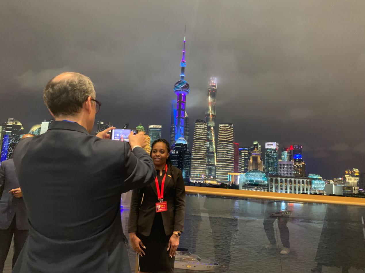 外國政黨代表在世界會客廳觀景臺拍照留念。人民網 馬作鵬攝