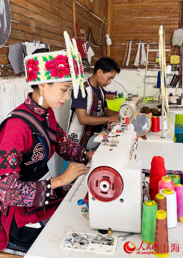 范加美和丈夫正在制作民族服裝。人民網記者 韓慶攝