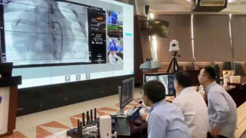 圖為上海中山醫院現場,葛均波院士團隊遠程操作機器人