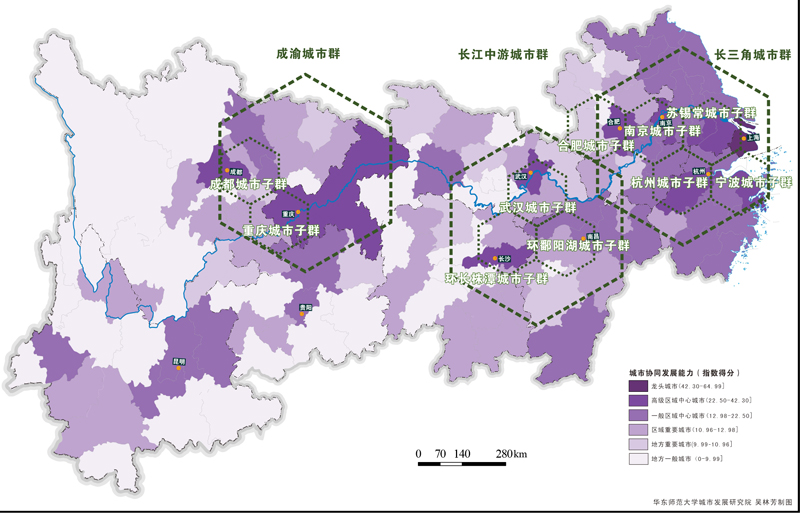 長江經濟帶城市協同發展能力指數(2023)表明,協同發展能力前十強城市依次為:上海、杭州、南京、成都、武漢、蘇州、無錫、重慶、合肥、長沙。長沙因各方面表現發展均衡,自2020年后再次回歸十強。曾剛指出,長江經濟帶城市協同發展能力穩步上升,城市體系橄欖型結構不斷優化,110座地級及以上城市呈現出6等級橄欖型結構特征:上海是龍頭城市,協同發展能力在長江經濟帶排名首位;杭州、南京、成都等10座城市是能力較強的高級區域中心城市;昆明、常州、貴陽等36座城市是在個別領域表現突出的一般區域中心城市;普洱、自貢、郴州等36座城市是區域重要城市,往往地處較為重要的區位或擁有某方面獨特的資源稟賦;亳州、巴中、資陽等15座城市是存在提升空間的地方重要城市;婁底、眉山、湘潭等12座城市是存在短板或外向服務功能薄弱的地方一般城市。