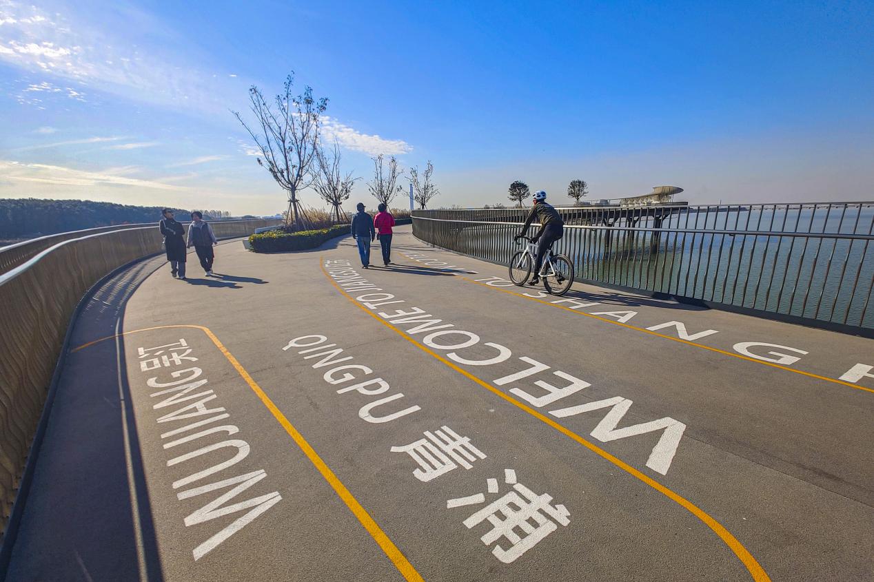 游客在“一腳踏兩地”的元蕩慢行橋上游玩。 人民網記者 王初攝