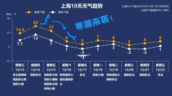 這也是氣溫最后的瘋狂了,周五寒潮就要來了。12月15至17日,上海將出現寒潮天氣,48小時最低氣溫降幅可達11℃至13℃;極端最低氣溫市區零下1℃到零下2℃,有薄冰,郊區零下6℃到零下3℃,有冰凍或嚴重冰凍;西北風風力增大。降水整體較弱,16日早晨前后可能出現短時雨夾雪。