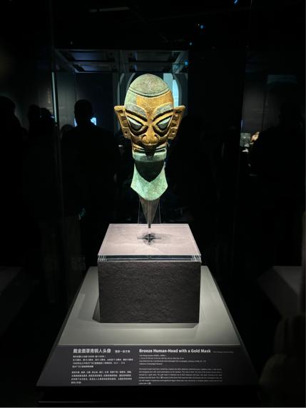 特展中包括神秘詭異的三星堆文物“青銅獸面”“金面具”“戴金面罩青銅人頭像”“青銅人形器”等。這些面具精湛的工藝和復雜的圖案,彰顯了古蜀人高超的鑄造技藝和豐富的想象力,具有古蜀文明的代表性、經典性。