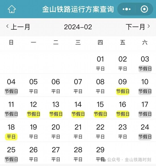 金山區新聞辦介紹,2024年春節假期期間,金山鐵路2月9日-17日執行節假日運行圖,2月18日調整為平日運行圖。平日和節假日運行圖有什么區別?詳見↓