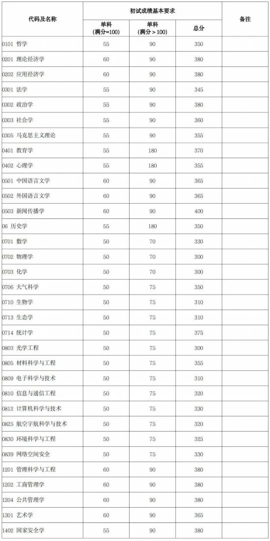 4.單獨考試考生:宗教學(專業代碼010107)要求考生滿分100分的單科成績不低于40分、滿分150分的單科成績不低于75分、總分不低于300分;中國史(專業代碼060200)要求考生滿分100分的單科成績不低于40分、滿分300分的單科成績不低于180分、總分不低于300分。