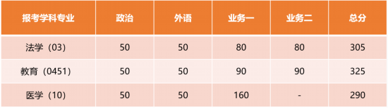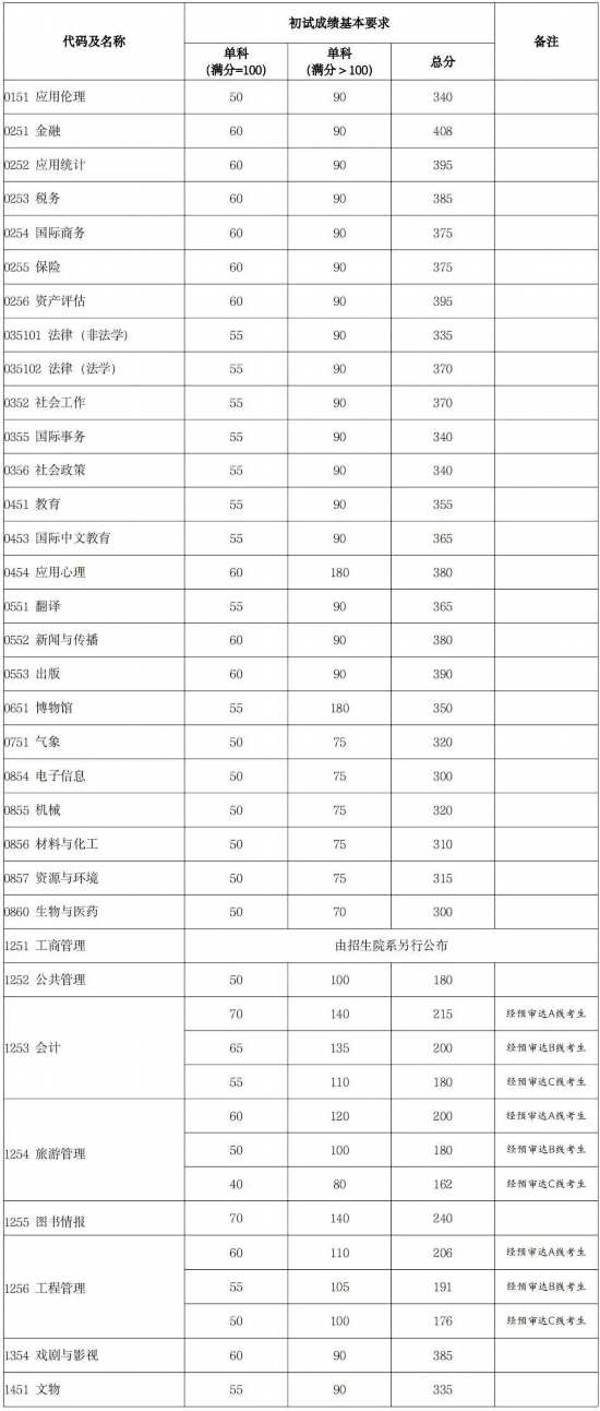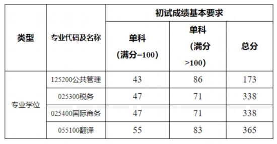 其中面向西藏地區“公共管理人才培養計劃”專項,要求考生滿分100分的單科成績不低于35分、滿分200分的單科成績不低于90分、總分不低于150分;面向新疆喀什地區醫學碩士專項,要求考生總分不低于251分。