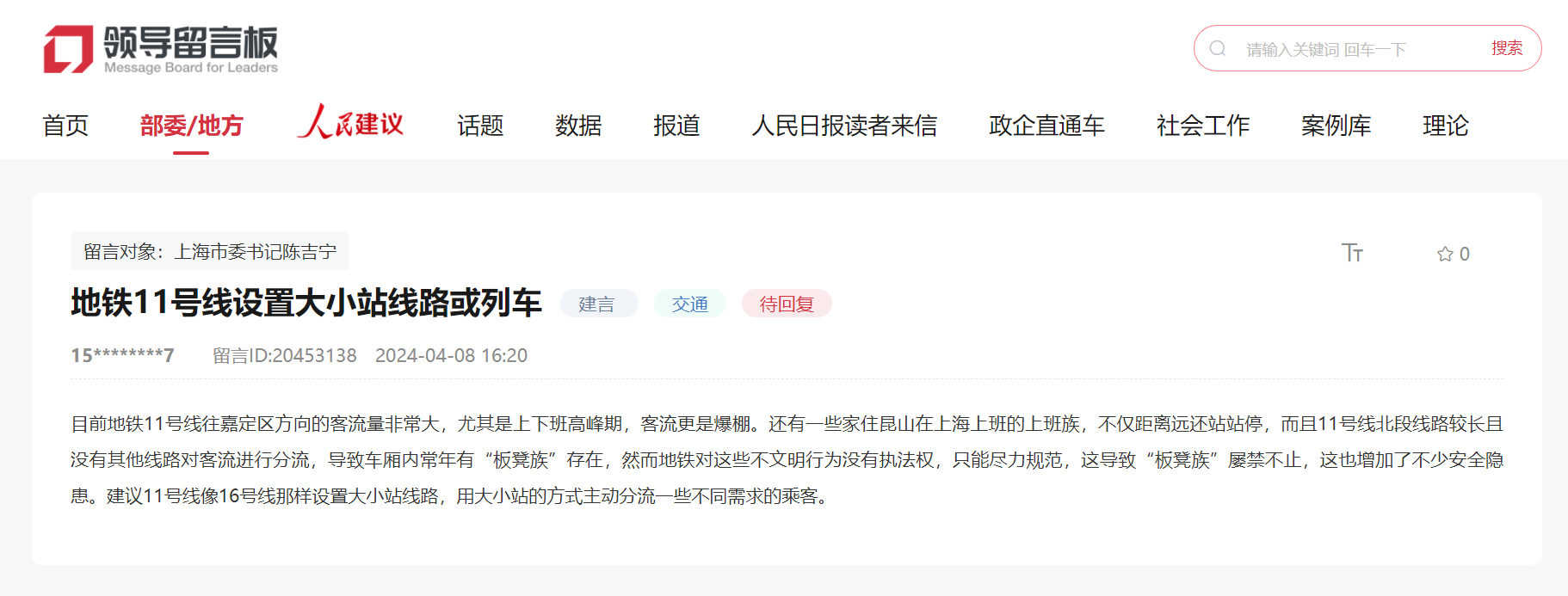 人民網上海4月15日電 (記者龔莎)“目前地鐵11號線往嘉定區方向的客流量非常大,尤其是上下班高峰期,客流更是爆棚?!苯?,有網友通過人民網“領導留言板”留言,反映上海地鐵11號線于上下班高峰期間存在客流量過大及“板凳族”等問題。對此,上海申通地鐵集團(以下簡稱“上海地鐵”)昨日接受記者采訪時進行了回復。