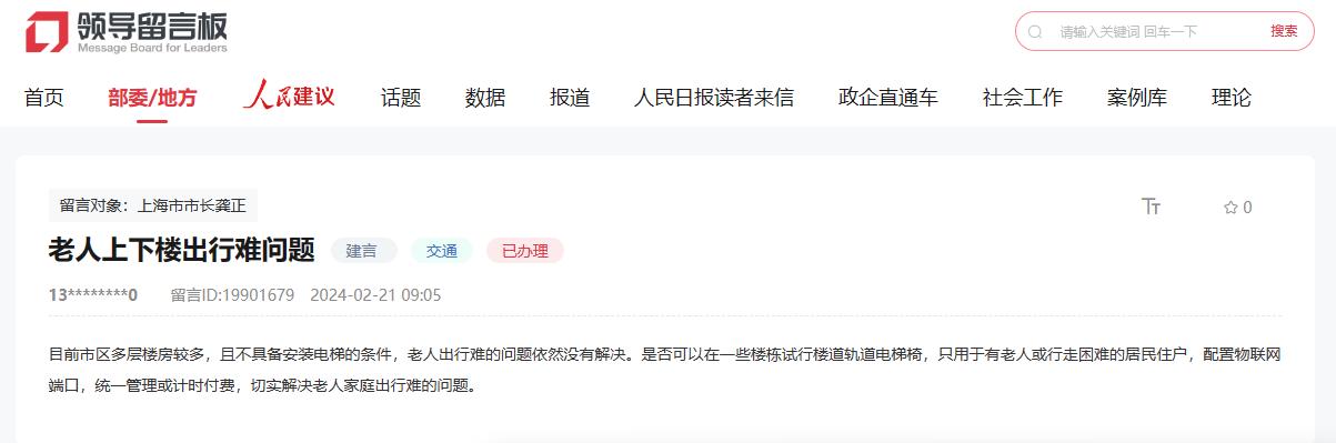 人民網上海4月19日電 (記者王文娟)隨著老齡化程度加深,老舊小區的上下樓問題難倒了不少高齡或失能老人。日前,有網友通過人民網“地方領導留言板”留言,上海目前市區多層樓房較多,且不具備安裝電梯的條件,存在老人出行難的問題。他建議,在一些樓棟試行樓道軌道電梯椅,只用于有老人或行走困難的居民住戶,并配置物聯網端口,統一管理或計時付費,解決老人家庭出行難的問題。