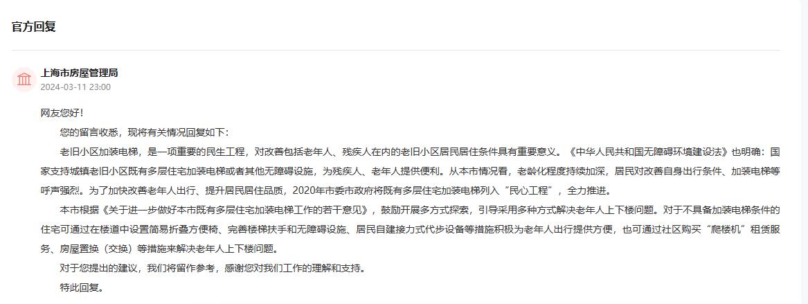 然而,推行加裝電梯需要滿足一定條件,也需要一段時間。為此,上海市房屋管理局回復:上海根據《關于進一步做好本市既有多層住宅加裝電梯工作的若干意見》,鼓勵開展多方式探索,引導采用多種方式解決老年人上下樓問題。對于不具備加裝電梯條件的住宅可通過在樓道中設置簡易折疊方便椅、完善樓梯扶手和無障礙設施、居民自建接力式代步設備等措施積極為老年人出行提供方便,也可通過社區購買“爬樓機”租賃服務、房屋置換(交換)等措施來解決老年人上下樓問題。