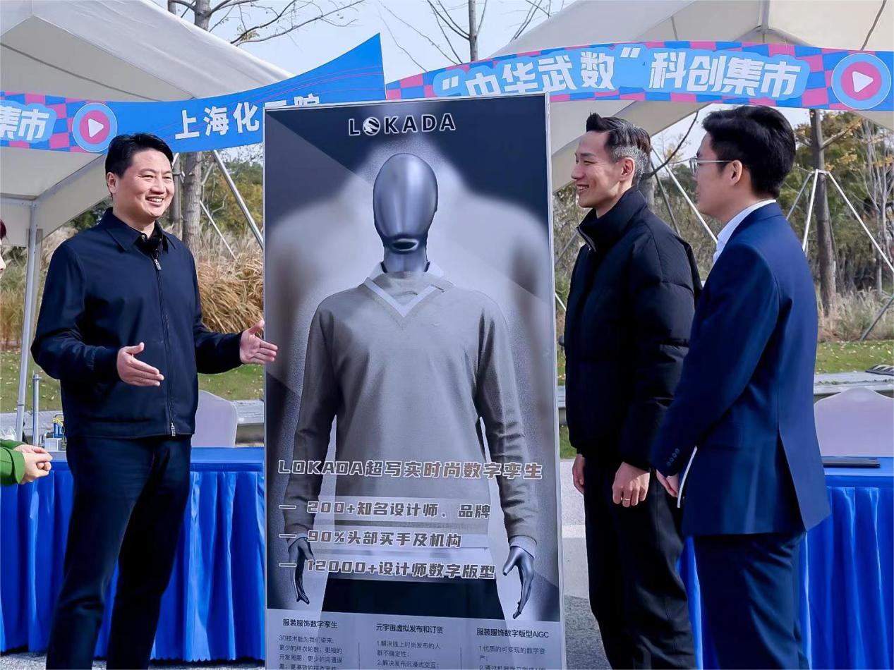 姜冬冬(左一)在“中華武數”科創集市與企業負責人交流了解企業創新科技成果。普陀區委宣傳部供圖