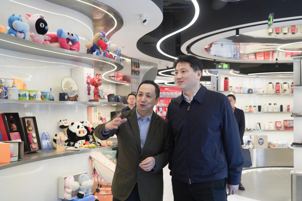 在元隆雅圖,企業負責人向姜冬冬介紹展現創意設計的產品。普陀區委宣傳部供圖