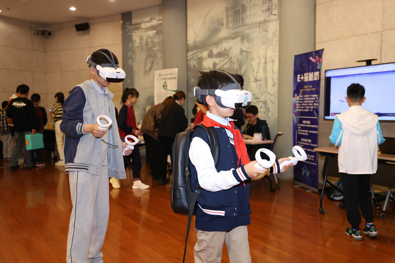 論壇展示交流暨總結會開始前,華東師范大學面向中小學生組織了一場別開生面的“創社展”,邀請“愛鳥俱樂部”“科學明航會”“追光”科普宣講團、O3協會、E+探秘坊等高??苿?、環保、公益類社團,以及涵楷教育、聯想煦象等面向中小學創客教育的創業企業,為中小學生提供了沉浸式體驗科技前沿的科學游園活動。同時,組織中小學生開展“創客行”活動,中小學生在朋輩導師的帶領下,參觀了華東師范大學智能教育研究院,實地體驗了科學前沿。