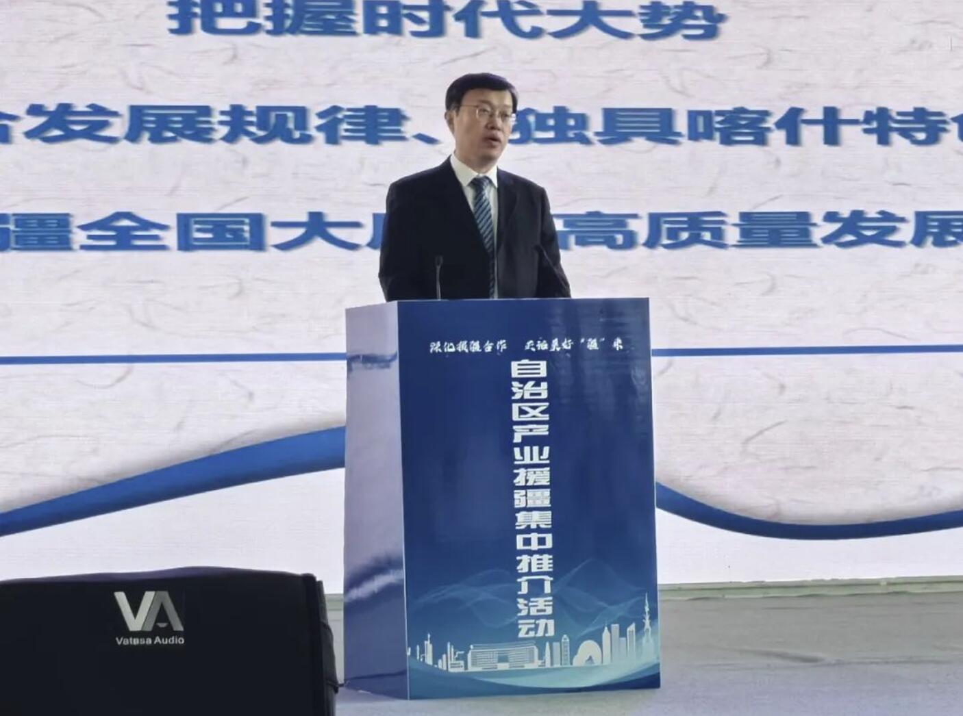 新疆維吾爾自治區黨委常委、自治區人民政府常務副主席陳偉俊致辭時指出,自治區將著眼釋放優勢潛力,加快建設“八大產業集群”,加快推進絲綢之路經濟帶核心區高質量發展,高標準推進中國(新疆)自由貿易試驗區建設,努力營造市場化法治化國際化營商環境,為企業發展、產業壯大創造良好條件。誠摯邀請廣大企業充分發揮自身優勢,積極投身產業援疆事業,加快推動在疆項目布局和投資建設,自治區將竭誠提供精準、高效服務,全力支持企業在新疆安心投資、順心發展,共創合作新機遇、共建發展新格局、共享發展新成果。