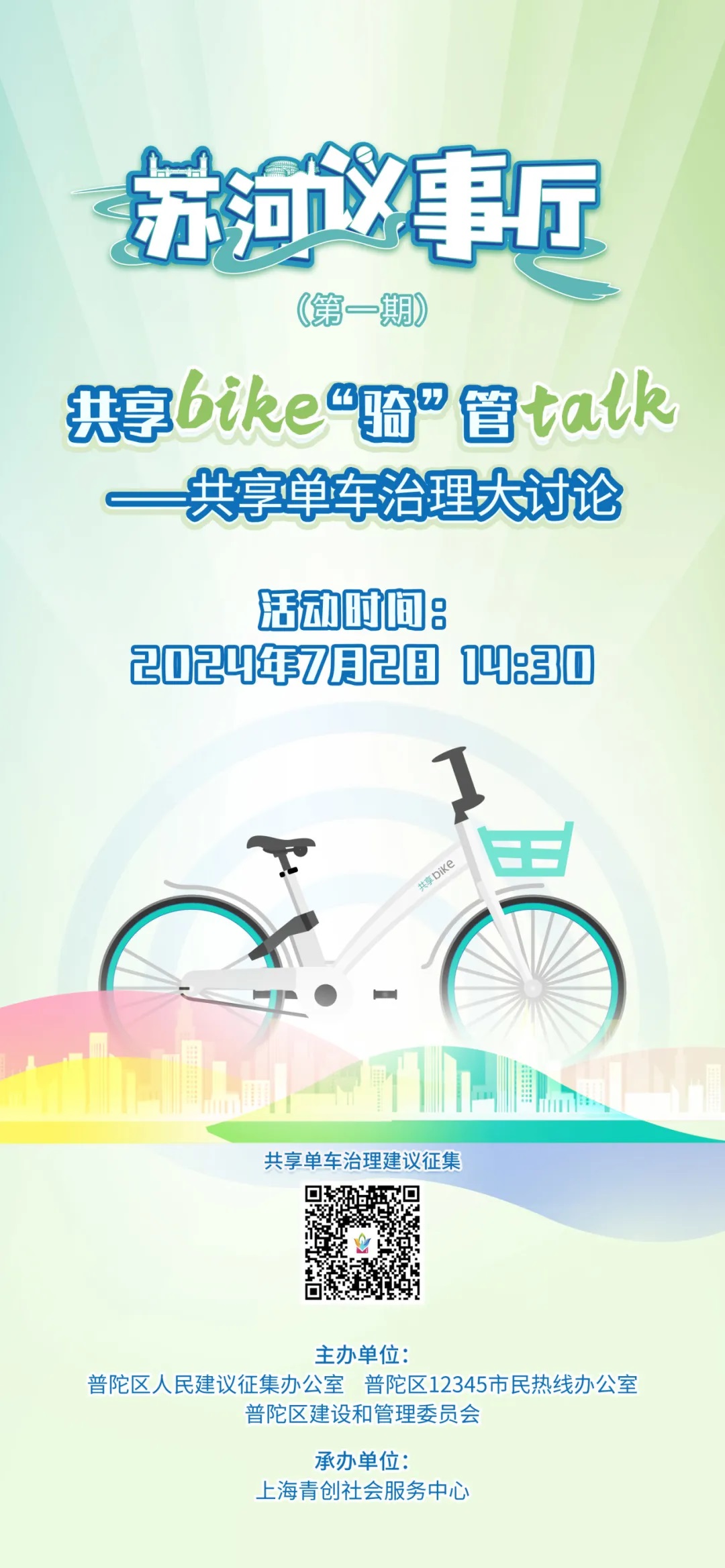 為進一步加強共享單車治理,7月2日(下周二)下午2點半,將在普陀區半馬蘇河驛站·長風灣黨群服務中心舉行蘇河議事廳(第一期)——“共享bike ‘騎’管talk”共享單車治理大討論活動?;顒訉⒀埳鐓^居民、共享單車企業、物業、社區工作者、街道代表,相關市級、區級職能部門、法律人士、媒體觀察員等,結合各自生活和工作實踐,就基層推進“共享單車治理”面臨的問題,共同想辦法、出點子。