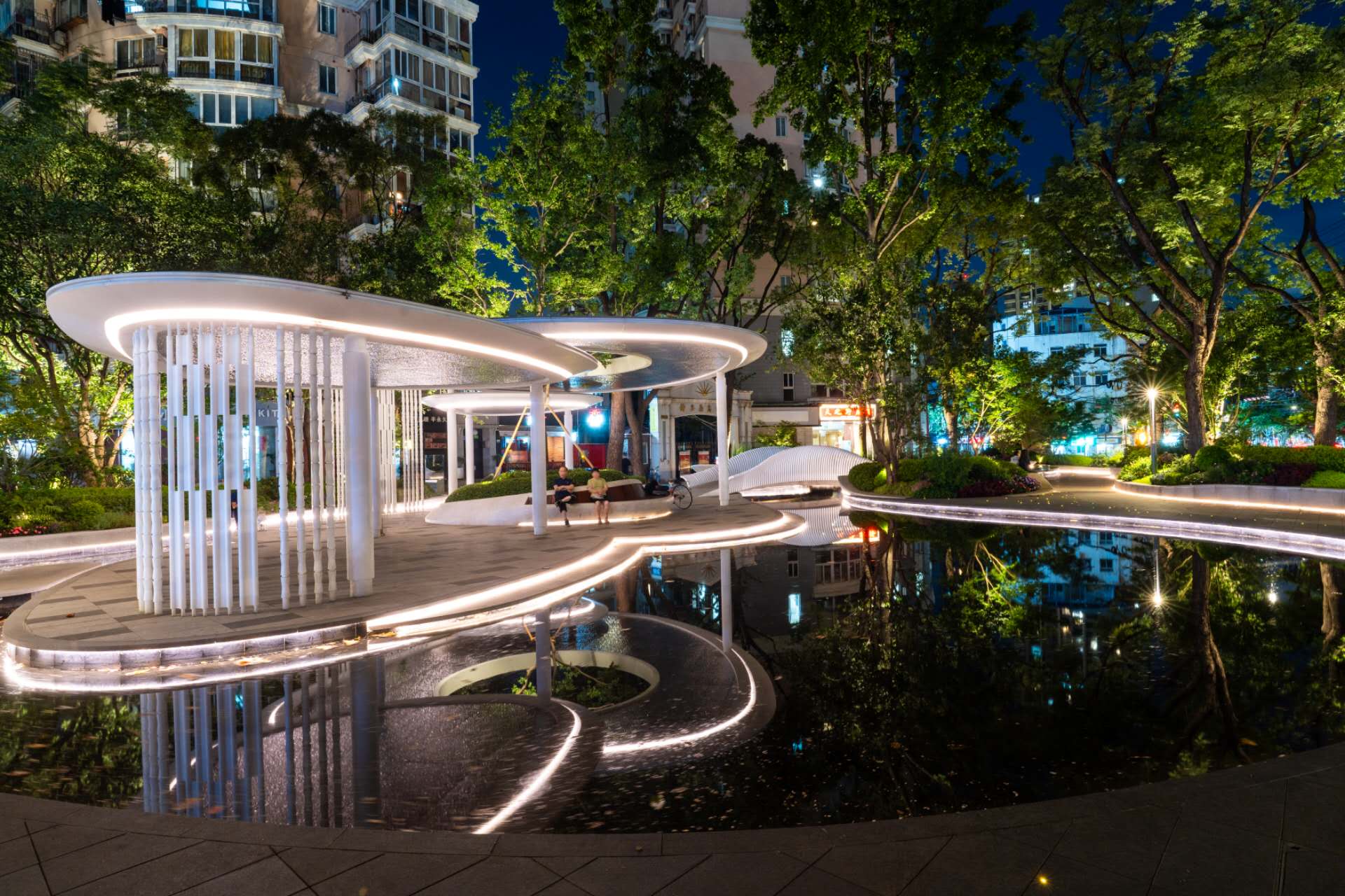 改建前就很受歡迎的西康路昌平路的溪夢園,在保留水景的同時,增加了疊水、噴泉、霧森等設計元素,提高了水景體驗的多樣性及趣味性,并聽取居民意見在園內增加了一處公共廁所,方便大家的日常需求。如今,夜晚的溪夢園在水池、燈光的映襯下顯得格外靜謐,仿佛是坐落在鬧市的一個世外桃源。