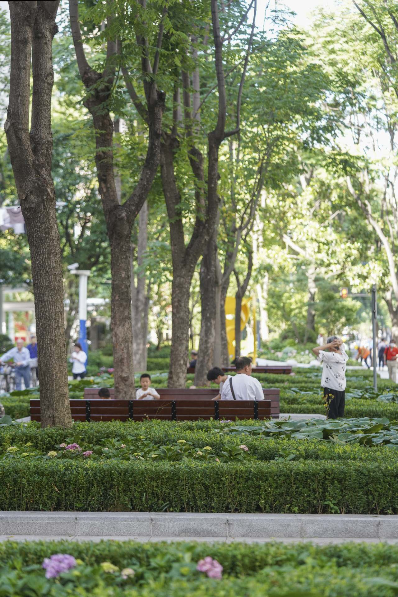 昌平路是上海著名的欒樹大道,夏季濃翠茂密,但在其他季節卻遮擋了明媚的陽光,道路兩旁的綠植也因年代久遠失去了原有的活力。靜安區在昌平路綠化現狀的基礎上,以欒樹林為“帶”,以周邊綠化為“園”,建設了上海首條“口袋公園帶”。
