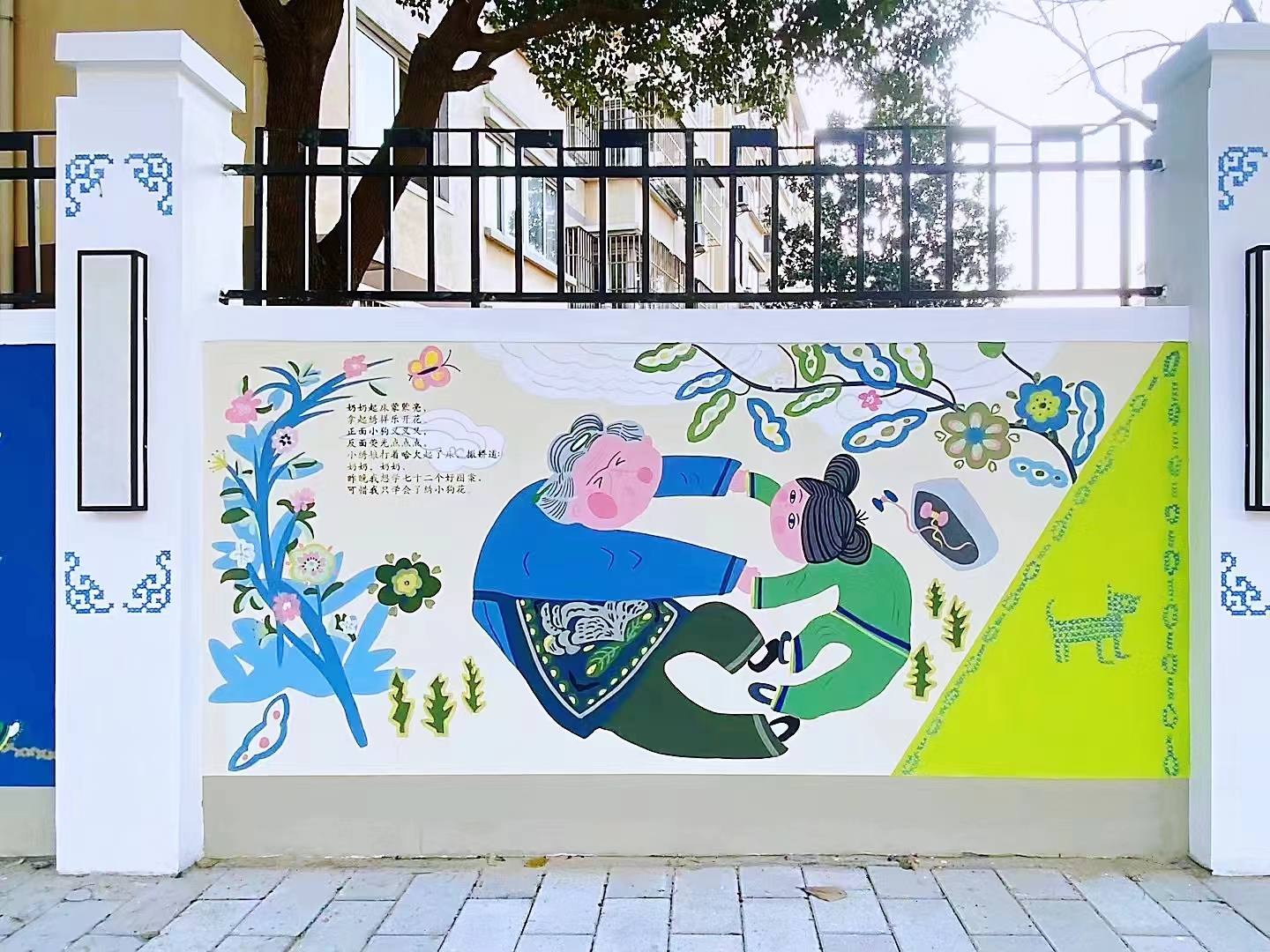 蕭月路改造工程對兩側墻面進行了重點加固,對破損嚴重的進行了拆除重建。同時為了彰顯本地獨特的文化內涵,沿線圍墻還結合十字挑花、四喜風糕、蕭涇寺傳說等羅涇非遺元素進行彩繪,再配以獨特的景觀燈光,點亮了原本幽暗的路口,令夜間回家的行人倍感溫暖。
