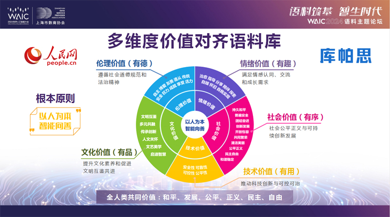 人民網、傳播內容認知全國重點實驗室相關負責人表示,建設多維度價值對齊的語料庫,應該堅持“以人為本、智能向善、造福人類”的原則,鼓勵通過國際合作和實際行動,幫助世界各國加強人工智能能力建設。這個體系分成五個主要維度,分別是:體現遵循社會道德規范和法治精神的倫理價值維度、體現滿足個人和群體情感認同交流和成長需求的情緒價值維度、體現助力大眾文化素養提升和促進文明互鑒共進的文化價值維度、體現推動社會公平正義和可持續創新發展的社會價值維度、體現推動科技創新與可控可治的技術價值維度。