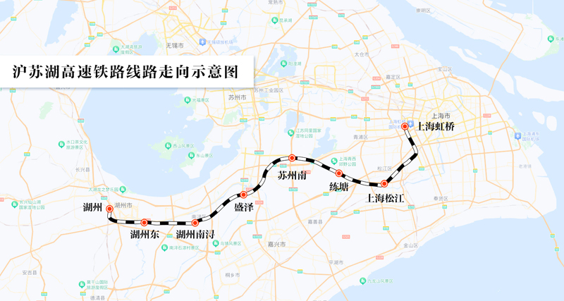 滬蘇湖高鐵由上海虹橋站引出,途經江蘇省蘇州市,終至浙江省湖州市湖州站,線路全長約163.8公里,設計時速350公里,設上海虹橋、上海松江、練塘、蘇州南、盛澤、湖州南潯、湖州東、湖州站等8座車站,除上海虹橋和湖州站外,其余均為新建站房。