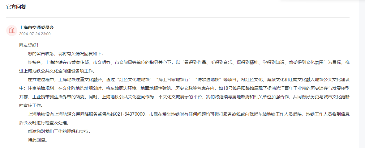 收悉網友留言后,上海市交通委員會回復表示,上海地鐵以“看得到作品、聽得到音樂、悟得到精神、學得到知識、感受得到文化氛圍”為目標,一直積極推進上海地鐵公共文化空間建設各項工作。